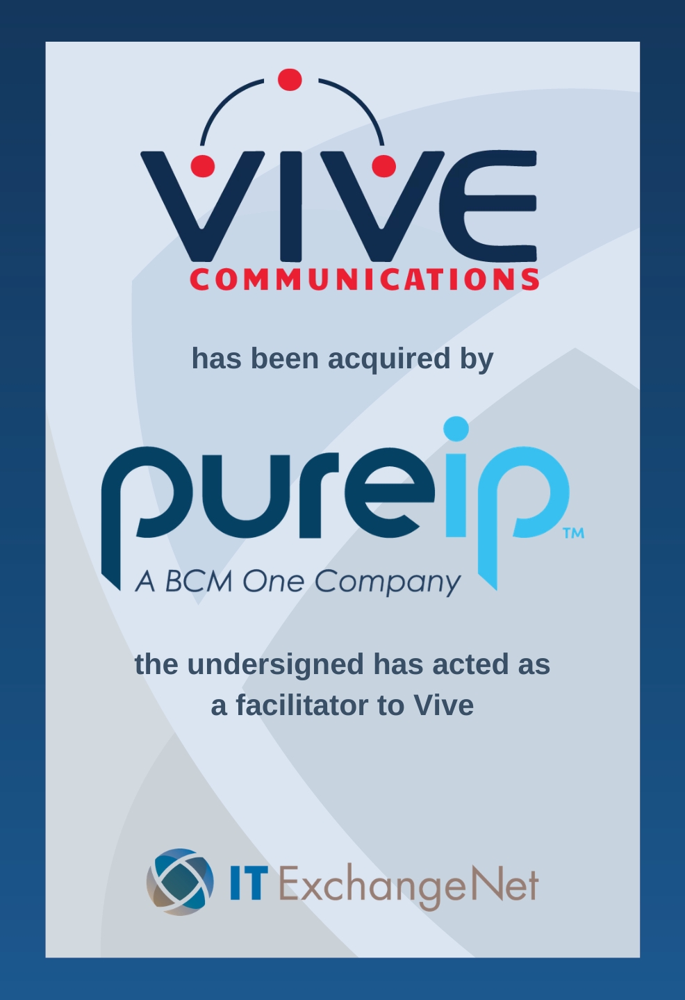 BRAINTREE, MA, UNITED STATES, April 7, 2026 /EINPresswire.com/ -- IT ExchangeNet, a leading M&A advisory firm serving mid-market VoIP, UCaaS, and IT-enabled businesses, today announced the acquisition of Vive Communications, a unified communications and collaboration solutions provider by Pure IP, a BCM One company, who is a global provider of voice, network and unified integration solutions for mid-to-enterprise businesses.Founded in 2001, Vive built a strong reputation for delivering comprehensive UCaaS, VoIP, and contact center solutions to enterprises across the U.S. The acquisition strengthens Pure IP’s unified communications portfolio and expands its national presence, adding Vive’s deep technical expertise and customer-centric service model to its growing platform.